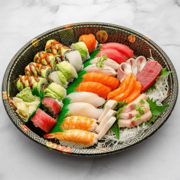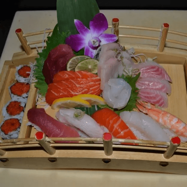 A special selection of 10 pieces of sushi, 15 pieces of sashimi and 2 chef's choice special rolls. Served with soup and salad