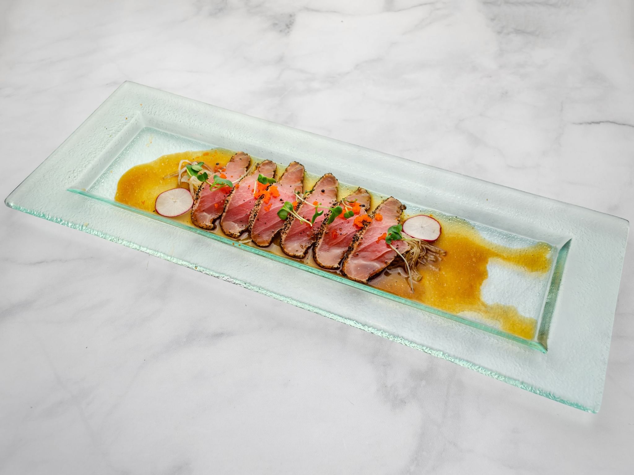 Seared pepper tuna and mixed greens with yuzu wasabi sauce
