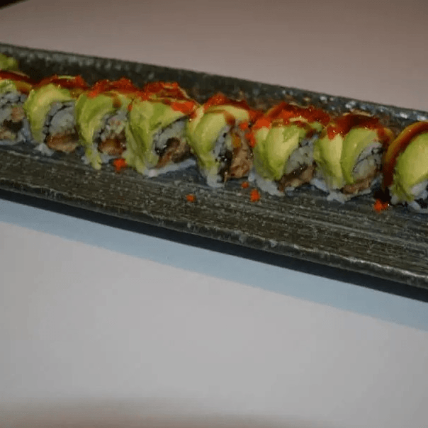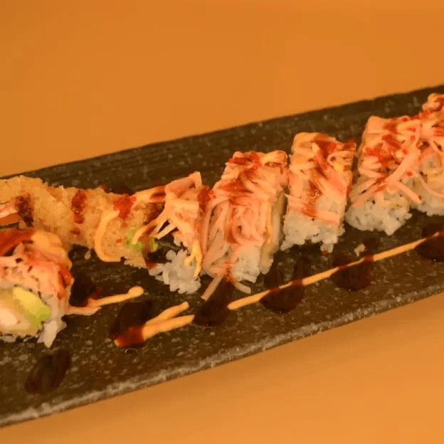 Shrimp tempura and avocado inside, spicy kani on top with eel sauce, spicy mayo and tobiko