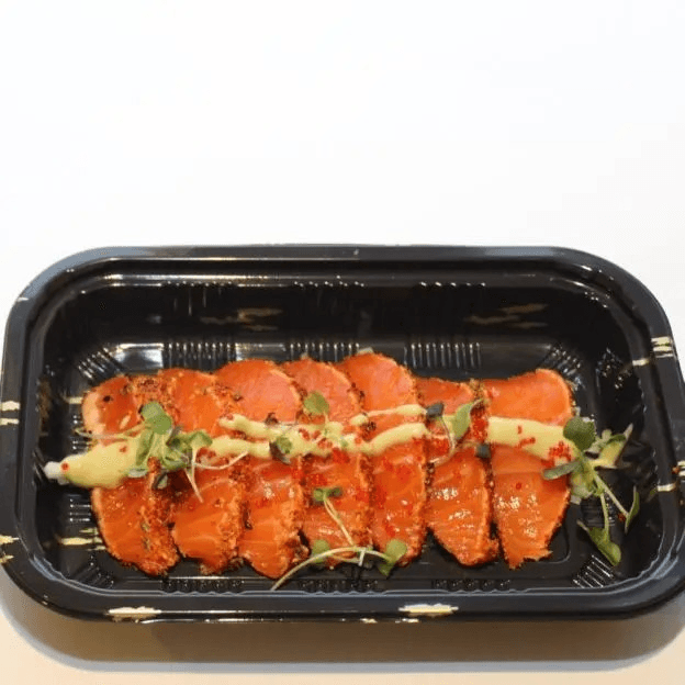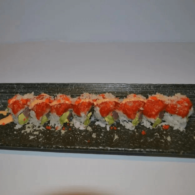 Peppered tuna and avocado inside, topped with spicy tuna, spicy mayo, masago and tempura flakes