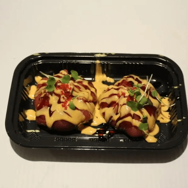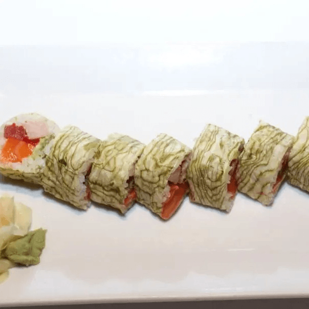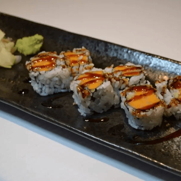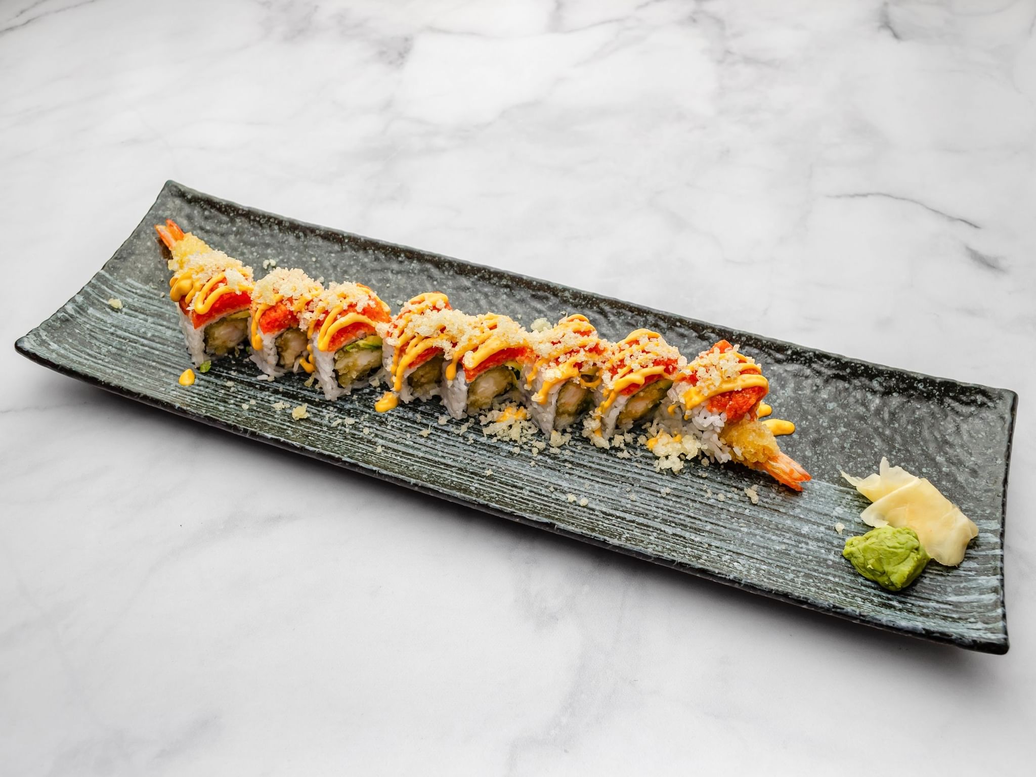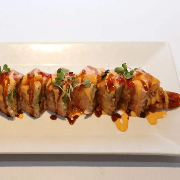 Spicy tuna, shrimp tempura inside, topped with mango, tobiko and drizzled with strawberry and wasabi sweet sauce