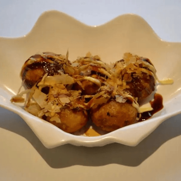 Shrimp tempura inside, topped with crabmeat and served with coconut sauce