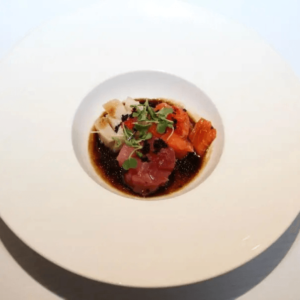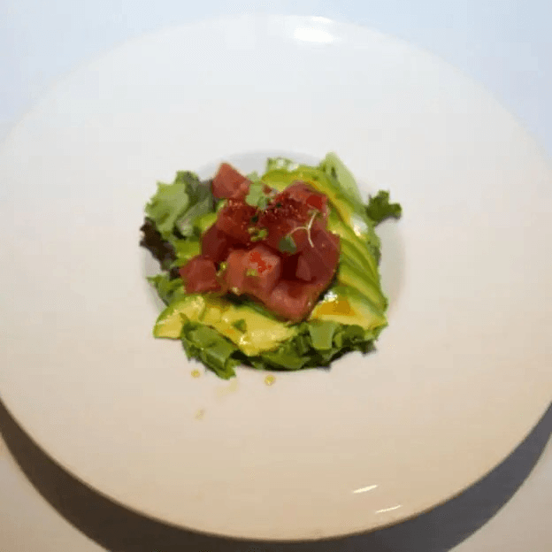 Spicy kani, avocado and mango wrapped with tuna, served with Japanese ponzu sauce, with microgreens on the top