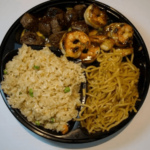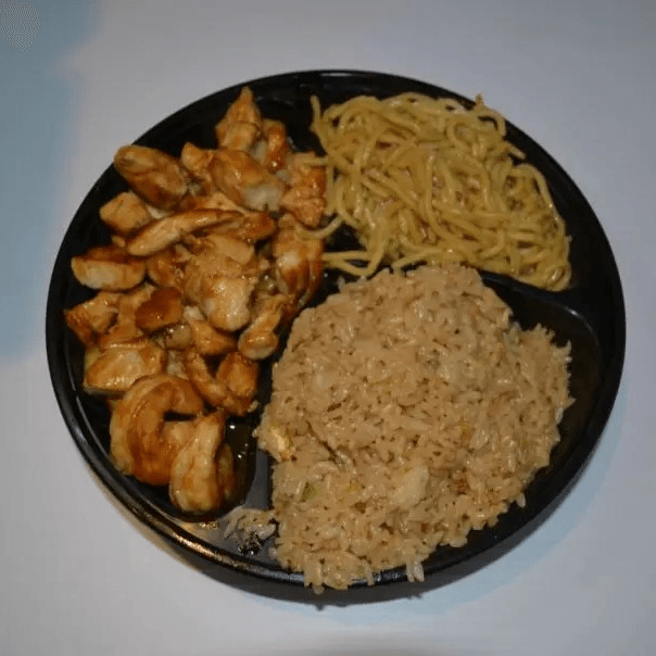 Served with clear soup, salad, 2 piece shrimp, vegetables, noodles and fried rice.