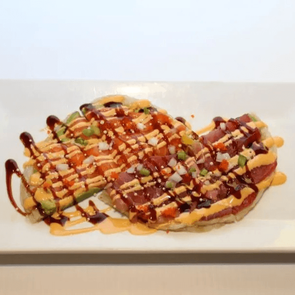 Asian pancake topped with guacamole, tuna, salmon, rice crackers, jalapenos, masago, scallions, spicy mayo and eel sauce