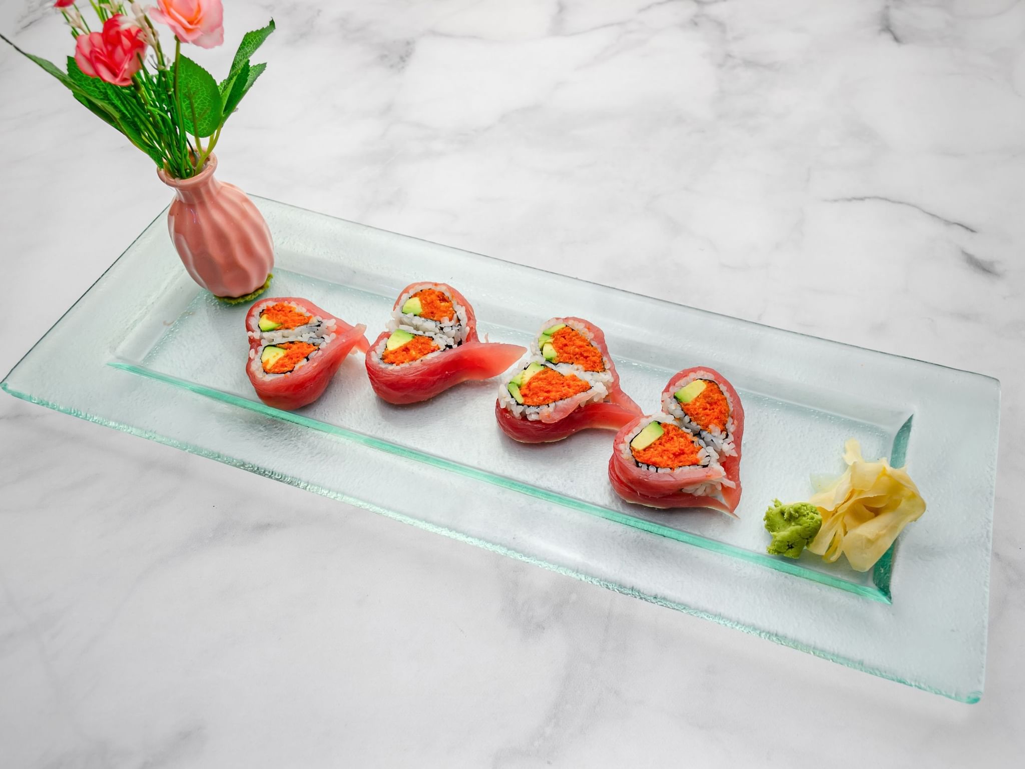 Spicy crunch tuna and avocado inside, topped with tuna maki heart style