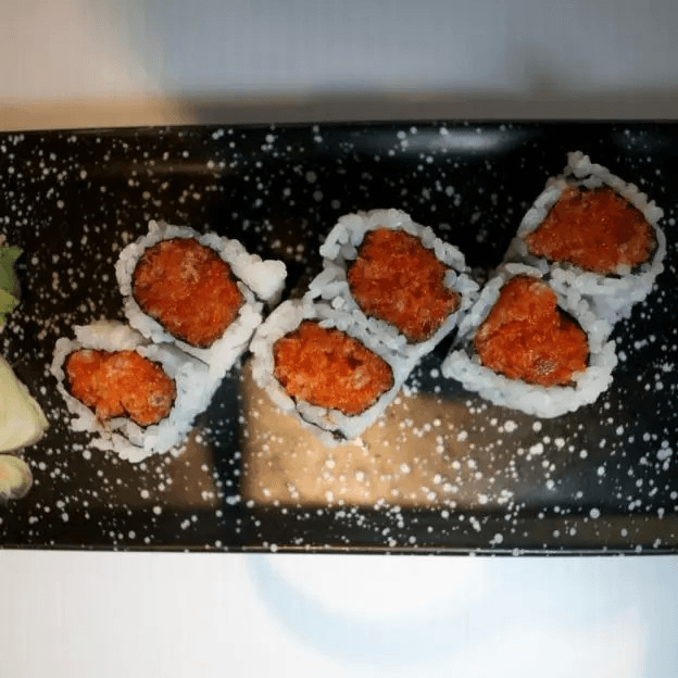 Shrimp tempura and avocado, topped with spicy tuna, tempura flakes and spicy mayo