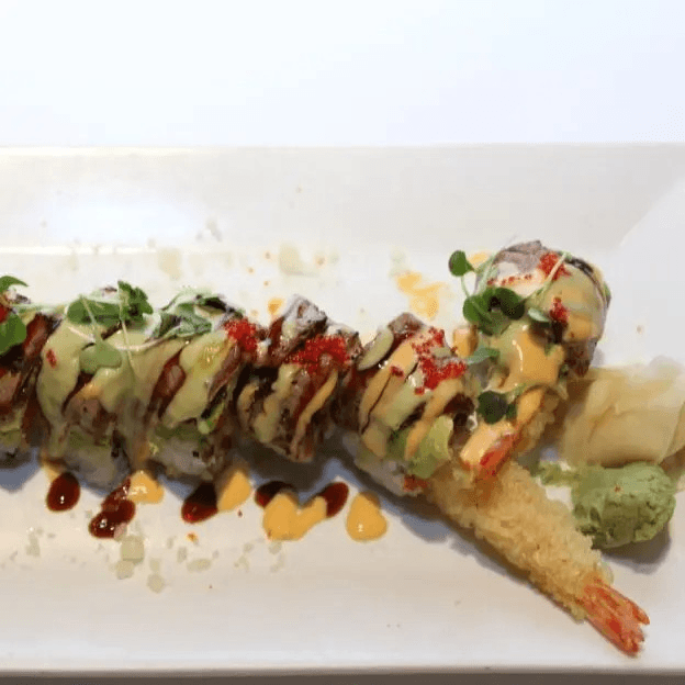 Shrimp tempura, spicy tuna inside topped with filet mignon, avocado on top spicy mayo, eel sauce, wasabi mayo and microgreens